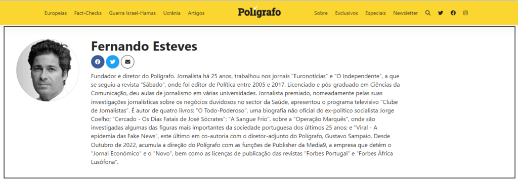 E mais: na nota biográfica de Fernando Esteves no próprio site do Polígrafo, há outra mentira. Está escrito que “desde Outubro de 2022, acumula a direção do Polígrafo com as funções de Publisher da Media9, a empresa que detém o Jornal Económico e o Novo, bem como as licenças de publicação das revistas Forbes Portugal e Forbes África Lusófona”, mas tal não é verdade.