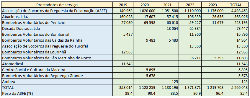 Em Junho desse ano, a administração do CHO passou para um contrato com duração de seis meses por 510.000 euros. Sem IVA, a ASFE ‘sacou’ 1.020.000 euros, ou seja, 90% do valor gasto pelo CHO nesse ano. A concorrência da ASFE ficou com ‘migalhas’: a empresa Abacinus (17.607 euros), o Centro Social e Cultural da Maceira (5.895 euros) e os bombeiros voluntários de Peniche (69.598 euros), das Caldas da Rainha (9.481 euros) e do Reguengo Grande (5.678 euros).