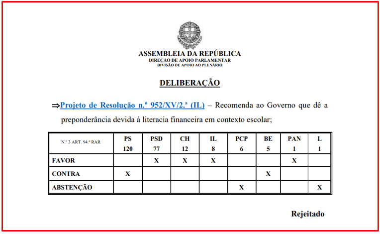 Ainda no dia 21 de Dezembro foi chumbada no parlamento uma recomendação ao governo para que “dê a preponderância devida à literacia financeira em contexto escolar”. A proposta teve os votos contra do PS e do Bloco e a abstenção do PCP e do Livre.
