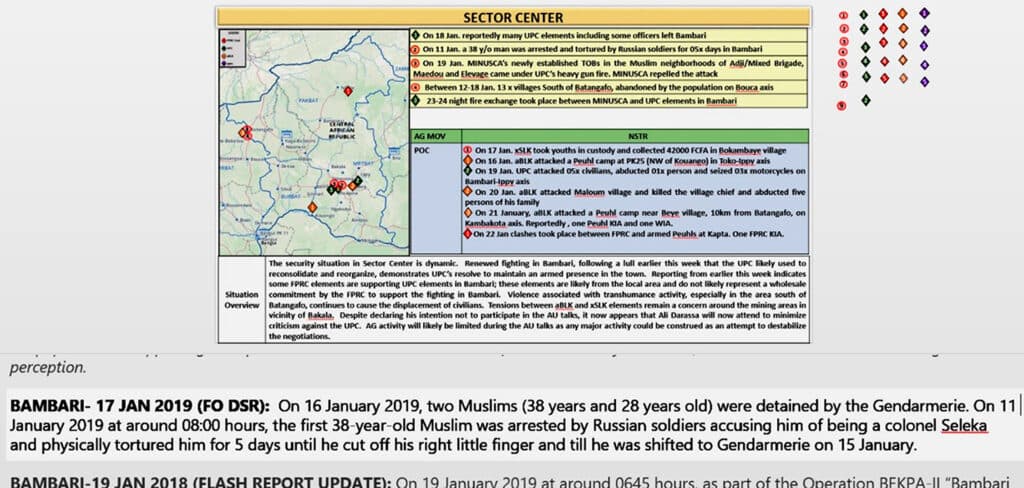 A avaliação U2 (elaborada pelo responsável da secreta da MINUSCA) em Bria é a seguinte: a missão dos russos e das Forças Armadas da República Centro-Africana (FACA) é “um reconhecimento ofensivo nos eixos BRIA-IPPY e BRIA-YALINGA” onde os rebeldes muçulmanos da UPC e da FPRC “estão particularmente activos”.