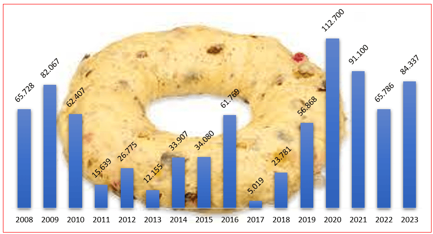 Só na última década, entre 2014 e 2023, os gastos das entidades públicas em bolo-rei para ofertas totalizaram 569.347 euros. Se se abranger o período com dados na plataforma da contratação pública, a partir de 2008, a factura sobe acima dos 834 mil euros. O ano de maiores gastos foi o de 2020, com 112.700 euros, embora a tendência seja de aumento dos gastos médios. Desde 2020, os bolos-reis para oferta têm custado, em média, cerca de 88 mil euros por ano aos cofres públicos. Não estão aqui incluídos os casos em que esta iguaria integra os famosos cabazes de Natal.