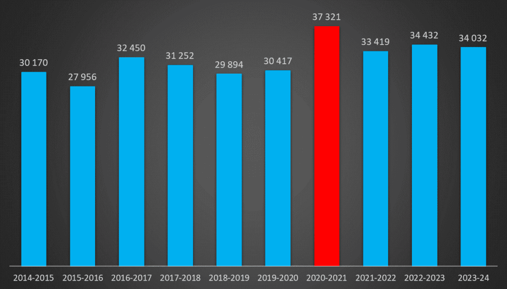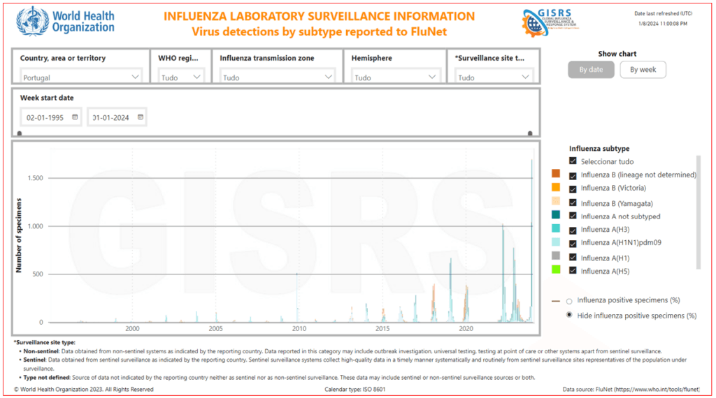 O recorde foi atingido na semana 51 de 2023, entre 18 e 24 de Dezembro, com o registo de 1.694 espécimes, com a esmagadora maioria (1526, ou seja, 90,1% do total) identificadas como pertencendo ao tipo A, mas de subtipo indeterminado. Os restantes espécimes eram de influenza A do subtipo H1N1 (159) – originário do surto de gripe suína de 2009 – e do subtipo H3 (apenas duas), além de constarem sete do tipo B de linhagem indeterminada. ↓