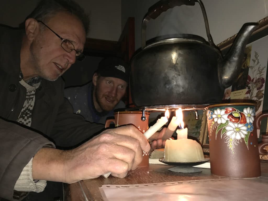 Chegamos a Qarah às 18:00. Somos convidados para jantar por um sírio influente. Acedemos. A única coisa que temos no bucho é um chá insípido.