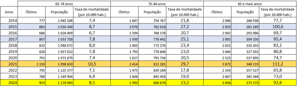 Quanto ao grupo dos 65 aos 74 anos, a situação do presente ano é quase semelhante ao da faixa etária subsequente, excepção para 2018 onde a taxa de mortalidade é ligeiramente inferior (8,1 vs. 8,0). Assim, o número de óbitos na primeira quinzena de 2024 para esta faixa etária (953) não é pior, do ponto de vista de Saúde Pública, do que, por exemplo, as 883 mortes neste grupo em 2015, por uma razão relevante: há agora mais quase 160 mil pessoas neste grupo etário.