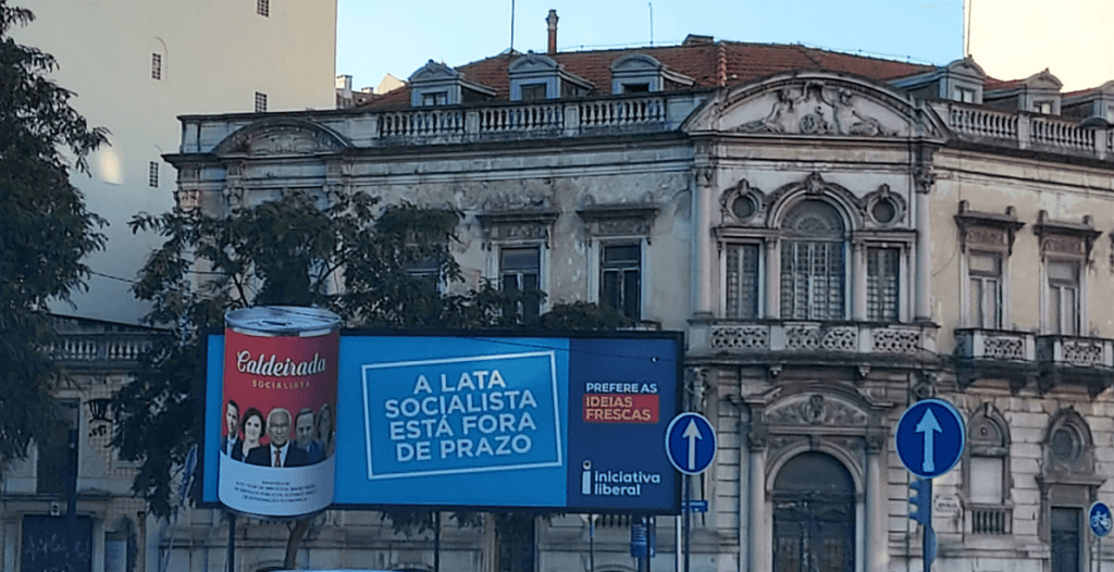 Na Praça do Saldanha, em Lisboa, o cartaz actual retrata a icónica lata de sopa de tomate (Campbell’s Soup), imortalizada pelo artista norte-americano Andy Warhol. Esta nova versão da lata “Caldeirada”, com líderes partidários, sugere que sob tais lideranças, podemos apenas esperar soluções padronizadas e uma governança moldada pela luta pelo poder. A frase “A lata socialista está fora de prazo” é emblemática, conjuntamente com a assinatura “Prefere as ideias frescas”, insinuam que as políticas do PS são insípidas e que esta caldeirada industrial é intragável. É curioso observar que este cartaz se inspira na figura de um artista que liderou o movimento da pop art, conhecido por seus valores ultraliberais e comportamentos controversos. Outro tema retratado nos cartazes da Iniciativa Liberal é a celebração do 25 de Novembro, como alusão ao dia em que a democracia liberal triunfou sobre a ditadura totalitária de Esquerda em Portugal. Carregada de simbolismo, a mensagem simples pretende motivar e credibilizar a mudança, apelando ao voto à direita.