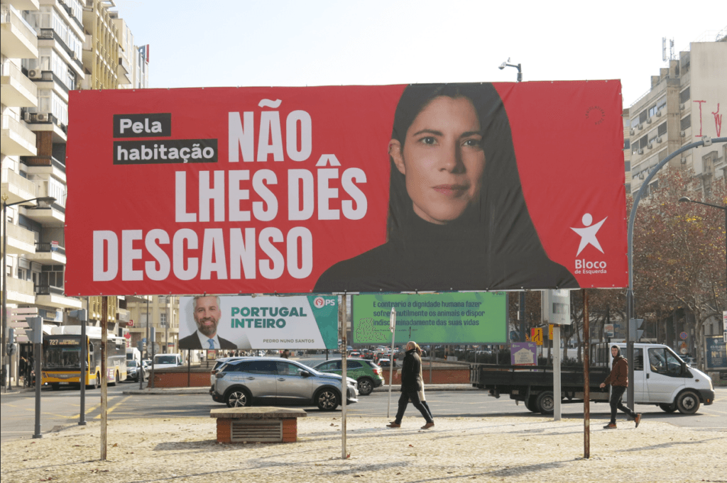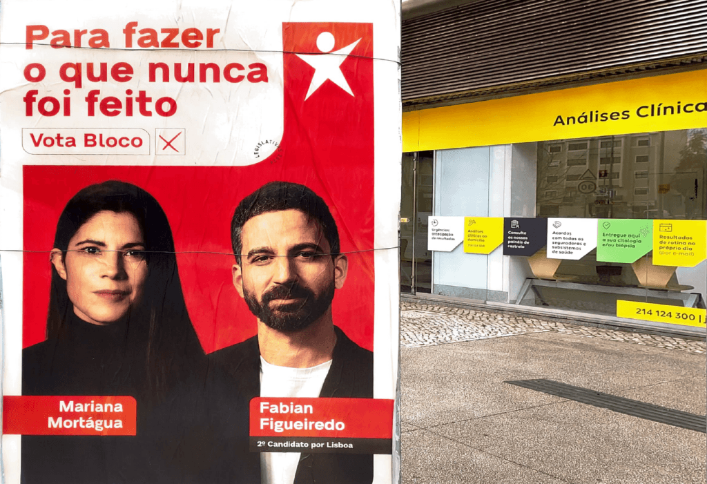A campanha de rua bloquista utiliza dois formatos principais: o mupi, cartaz ao alto geralmente instalado em estruturas próprias fixadas no chão, e os outdoors de grande formato (8×3 metros). Ambos estão colocados em locais de elevada afluência, onde todos os partidos competem por visibilidade. De acordo com uma sondagem recente conduzida pela Universidade Católica, o partido prevê conquistar apenas 5% dos votos, mantendo-se atrás da Iniciativa Liberal e ocupando a 5ª posição no ranking eleitoral.