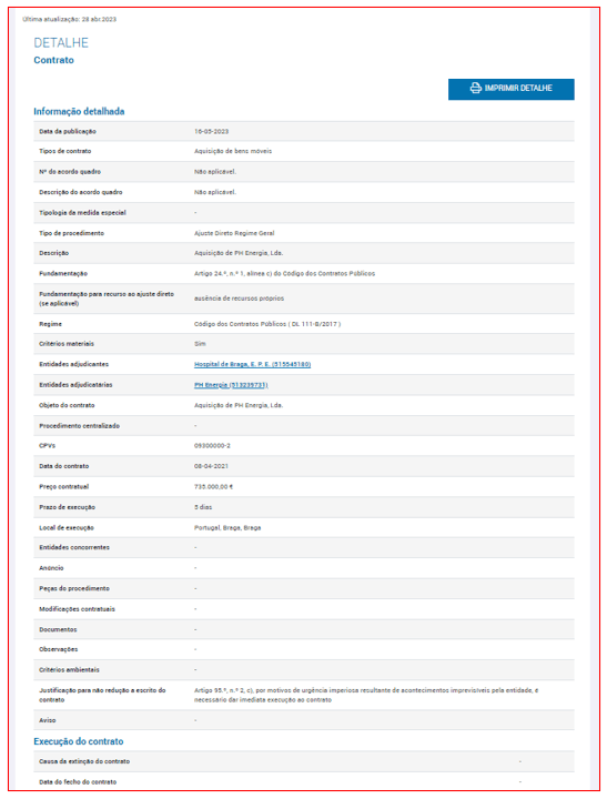Celebrado em 8 de Abril de 2021, com um prazo de execução de apenas cinco dias – o que dá um custo médio de 147 mil euros por dia – não foi alvo de contrato escrito, por alegados (e não justificados) “motivos de urgência imperiosa resultante de acontecimentos imprevisíveis” pelo Hospital de Braga. Na descrição do contrato no Portal Base surge a seguinte uma obtusa descrição: “Aquisição de PH Energia, Lda”. Resta acrescentar que, embora este contrato tenha tido data de 8 de Abril de 2021 somente foi inscrito no Portal Base em 16 de Maio de 2023, ou seja, 25 meses depois.