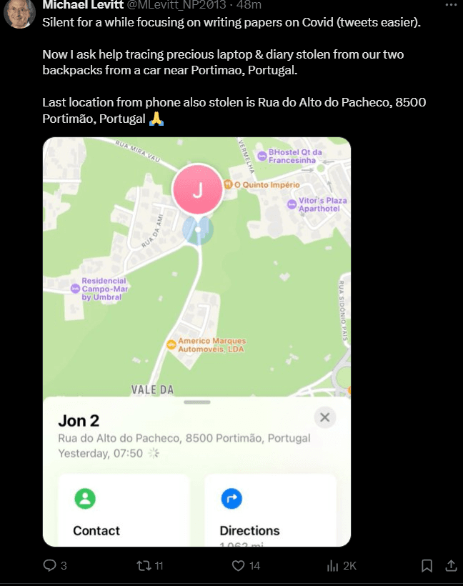 Levitt começou por dizer, na sua mensagem publicada há poucas horas, que tem estado em “silêncio por um tempo”, estando “focado em escrever artigos sobre covid”. “Agora peço ajuda para rastrear preciosos laptops e diários roubados das nossas duas mochilas de um carro perto de Portimão, Portugal”, apela.