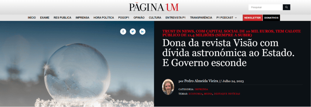 Senão vejamos. A Trust in News devia no final de 2018 cerca de 942 mil euros ao Estado. Um ano depois subia para quase 1,6 milhões; em 2020 pulou para 5,1 milhões de euros; a seguir para 8,2 milhões e em 2022 estava já em 11,4 milhões de euros. O PÁGINA UM foi o primeiro e único jornal a falar deste vergonhoso estado de uma empresa de media, em Julho do ano passado.
