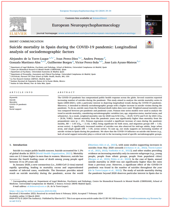 O estudo sociodemográfico elaborado por uma equipa multidisciplinar de Espanha, Estados Unidos e México confirma “um número crescente de vítimas de suicídio na Espanha durante a pandemia”, concluindo que “a influência da covid-19 nos factores de risco de suicídio [por exemplo, falta de redes de apoio social] desempenha[ram} um papel crítico na tendência crescente de grupos sociodemográficos específicos”.