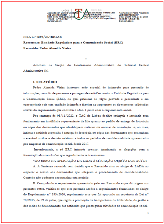 Assinado pelos três desembargadores deste tribunal superior nos dias 24 e 26 de Abril – simbolicamente no dia antes e no dia posterior aos 50 anos do início do regime democrático que concedeu teoricamente liberdade de imprensa e de acesso à informação –, o acórdão reforça uma sentença já emitida em Novembro de 2022 pelo Tribunal Administrativo de Lisboa, mas que não foi acatado pela ERC, que recorreu para o TCAS.
