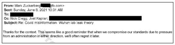 Contudo, adianta o relatório do comité da Câmara dos Representantes, o Facebook percebeu, um meses mais tarde, que a Casa Branca “preocupava-se mais em censurar conteúdos anti-vacina” e assim foi levantada a censura sobre conteúdos relativos à fuga laboratorial como origem da covid-19. Surge mesmo referido que, em Julho de 2021, um executivo do Facebook, Nick Clegg, perguntou num e-mail a um funcionário do Facebook a razão de se censurar a teoria da criação do vírus SARS-CoV-2 em laboratório, que obteve a seguinte resposta: “Porque estávamos sob pressão do Governo [Biden] e de outros para fazer mais. . . . Não deveríamos ter feito isso”.