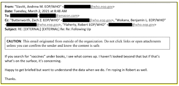 Numa secção do relatório com o título ‘Amazon Files’, é relatado que, em Março de 2021, a Casa Branca enviou um e-mail ao vice-presidente de Políticas Públicas da Amazon, pedindo para haver uma discussão sobre os “altos níveis de propaganda e desinformação” na empresa de venda de produtos online. O Governo de Biden alegava então que vários membros da Casa Branca tinham feito pesquisas na Amazon com a palavra-chave “vacinas” e enviou capturas de ecrã por e-mail da página de resultados de pesquisa para a Amazon, observando que se se adicionasse um aviso do Centros de Controle e Prevenção de Doenças (CDC) seria insuficiente para censurar adequadamente os livros.