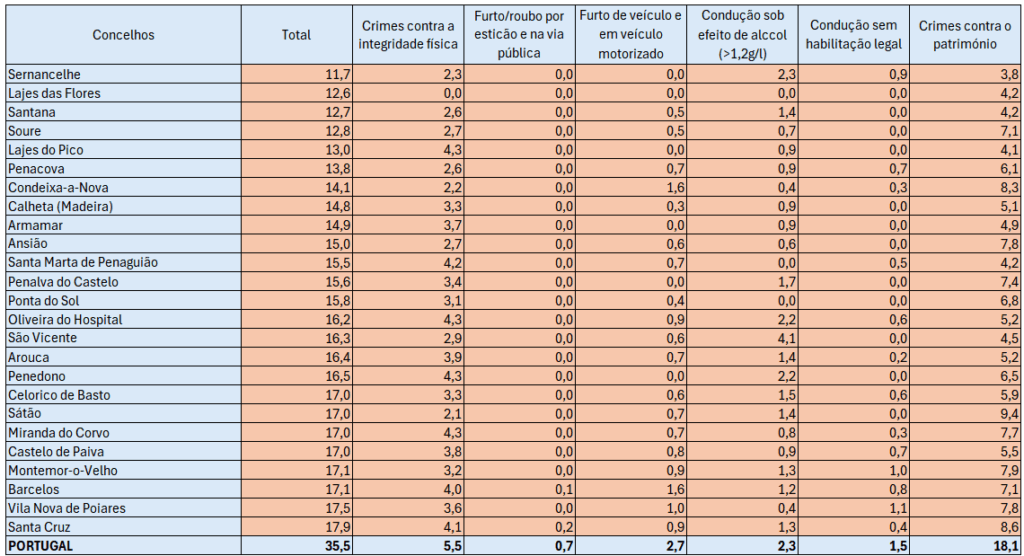 No lado oposto, como concelhos com menor taxa de criminalidade total estão Sernancelhe (11,7 crimes por mil), Lajes das Flores (12,6 por mil), Santana (12,7 por mil), Soure (12,8 por mil) e Lajes do Pico (13,0 por mil), sendo que a região do Ave é aquela com melhor indicador (20,9 por mil)