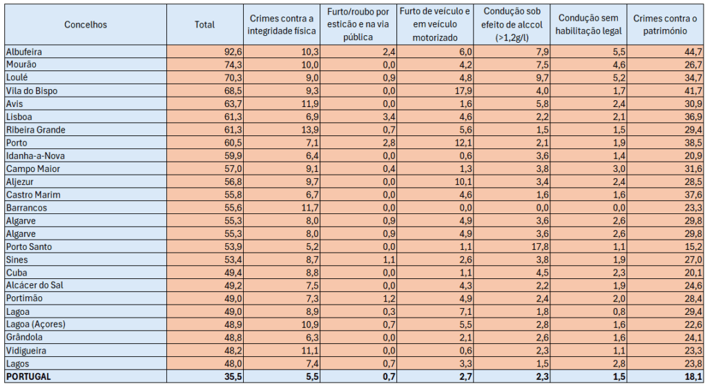 Curiosamente, ou talvez não, no top 25 não constam mais nenhum município de grande dimensão em termos populacionais, destacando-se, ao invés, concelhos rurais e, alguns do interior, como Avis, Idanha-a-Nova, Campo Maior, Barrancos, Cuba e Vidigueira. Em termos regionais, o Algarve apresenta-se como a região com piores indicadores, ressalvando, mais uma vez, que se está perante uma taxa de crimes por habitantes, que não inclui o fluxo de turistas, nem a abundância de muitas casas de segunda habitação mais susceptíveis à criminalidade.