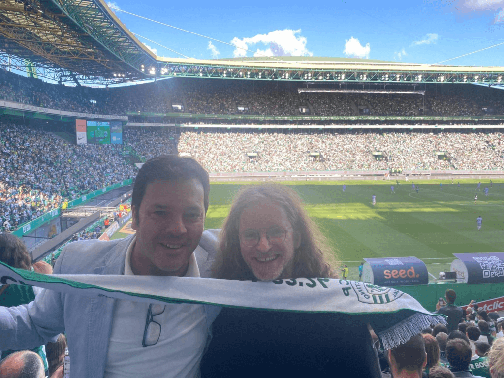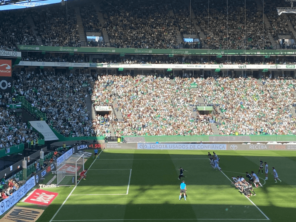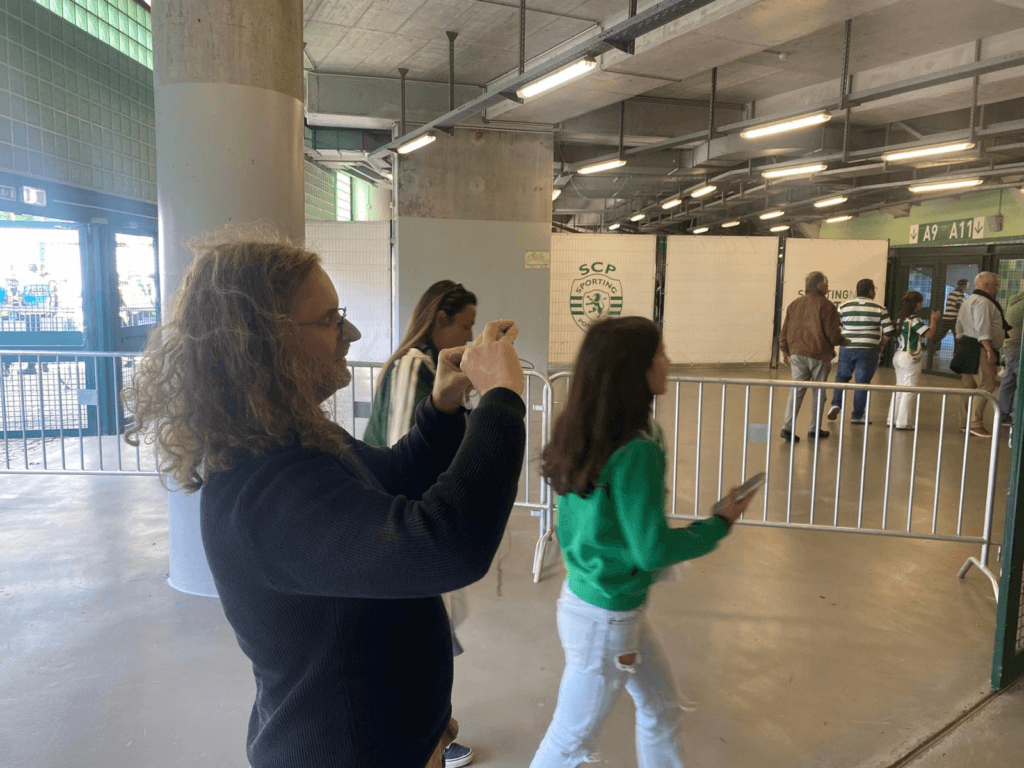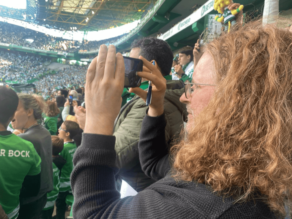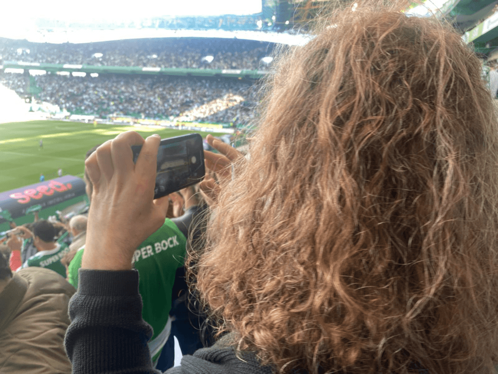 Antes do jogo começar, ao meu lado na bancada central, o telemóvel mais frenético do estádio é o do senhor director do PÁGINA UM. Ele aponta para todo o lado, compondo vídeos e fotografias aos ziguezagues, imolando as fintas rápidas e súbitas paragens do Trincão. Ao ver Pedro Almeida Vieira neste torpor místico e alucinado, compreendo como se sentiram Eduardo Gageiro, na manhã do 25 de Abril, e o astronauta Neil Armstrong de câmara na mão e pés na lua. ↓