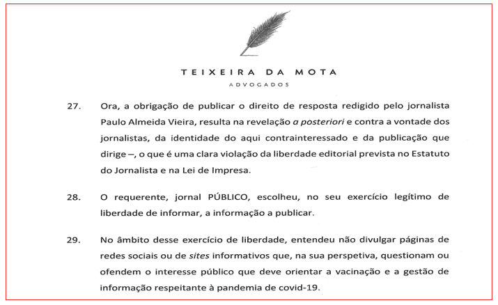 Aquando do processo de um direito de resposta do PÁGINA UM, que envolveu a Entidade Reguladora para a Comunicação Social (ERC), o jornal Público tentou, em meados de 2022, evitar a sua publicação apresentando uma providência cautelar no Tribunal Administrativo, que obviamente perdeu, Mas é nessa peça jurídica, apresentada pelo advogado do Público Francisco Teixeira da Mota (e choca-me vê-lo nesses ‘preparos’) que se revela o papel de colaboracionista daquele jornal durante a pandemia, pela mão do lastimável então director, o suposto jornalista Manuel Carvalho.