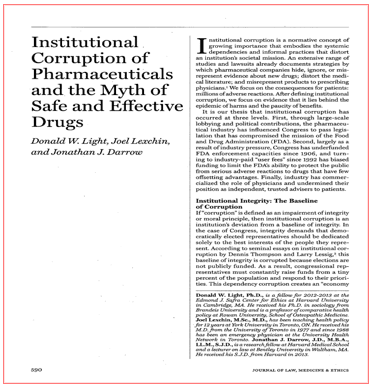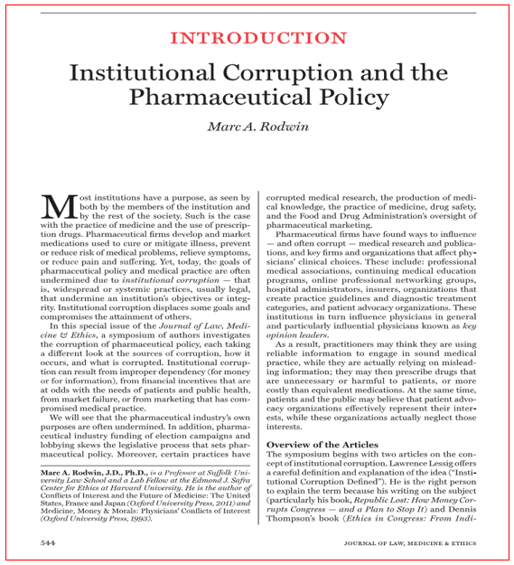 Hoje, os objectivos da política farmacêutica e da prática médica são frequentemente prejudicados devido à corrupção institucional – isto é, práticas generalizadas ou sistémicas, geralmente legais, que prejudicam os objectivos ou a integridade de uma instituição. Veremos que os próprios objectivos da indústria farmacêutica são frequentemente prejudicados. Além disso, o financiamento de campanhas eleitorais e de lobbying pela indústria farmacêutica distorce o processo legislativo que define a política farmacêutica. Além disso, certas práticas corromperam a investigação médica, a produção de conhecimento médico, a prática da medicina, a segurança dos medicamentos e a supervisão do marketing farmacêutico pela Food and Drug Administration. Como resultado, os profissionais podem pensar que estão a utilizar informações fiáveis para se envolverem numa prática médica sólida, ao mesmo tempo que, na verdade, confiam em informações enganosas e, portanto, prescrevem medicamentos que são desnecessários ou prejudiciais aos pacientes, ou mais dispendiosos do que medicamentos equivalentes. Ao mesmo tempo, os pacientes e o público podem acreditar que as organizações de defesa dos pacientes representam efectivamente os seus interesses, enquanto estas organizações na verdade negligenciam os seus interesses.