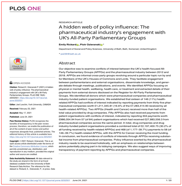 3 – Rickard E, Ozieranski P. A hidden web of policy influence: The pharmaceutical industry’s engagement with UK’s All-Party Parliamentary Groups. PLoS One. 2021 Jun 24;16(6):e0252551. doi: 10.1371/journal.pone.0252551. PMID: 34166396; PMCID: PMC8224875. (FICHEIRO 4)
