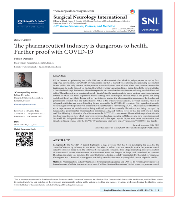 1 – Deruelle F. The pharmaceutical industry is dangerous to health. Further proof with COVID-19. Surg Neurol Int. 2022 Oct 21;13:475. doi: 10.25259/SNI_377_2022. PMID: 36324959; PMCID: PMC9610448. (FICHEIRO 7)