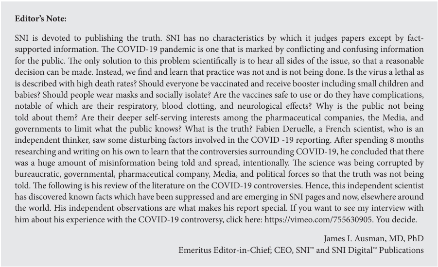 A SNI [Surgical Neuroloy International] se dedica a publicar a verdade. O SNI não possui características pelas quais julga os artigos, excepto por informações baseadas em factos. A pandemia da COVID-19 é marcada por informações conflituantes e confusas para o público. A única solução científica para este problema é ouvir todos os lados da questão, para que uma decisão razoável possa ser tomada. Em vez disso, descobrimos e aprendemos que a prática não foi e não está sendo feita. O vírus é letal como é descrito com altas taxas de mortalidade? Todos deveriam ser vacinados e receber reforço, incluindo crianças pequenas e bebês? As pessoas deveriam usar máscaras e isolar-se socialmente? As vacinas são seguras para uso ou apresentam complicações, entre as quais se destacam os efeitos respiratórios, de coagulação sanguínea e neurológicos? Por que o público não está sendo informado sobre eles? Será que os seus interesses egoístas mais profundos entre as empresas farmacêuticas, os meios de comunicação social e os governos estão a limitar o que o público sabe? O que é a verdade? Fabien Deruelle, um cientista francês, que é um pensador independente, viu alguns factores perturbadores envolvidos nos relatórios sobre a COVID-19. Depois de passar oito meses pesquisando e escrevendo por conta própria para saber das controvérsias em torno do COVID-19, ele concluiu que havia uma enorme quantidade de desinformação sendo contada e espalhada intencionalmente. A ciência estava a ser corrompida por forças burocráticas, governamentais, farmacêuticas, mediáticas e políticas, para que a verdade não fosse dita. A seguir está a sua revisão da literatura sobre as controvérsias do COVID-19. Consequentemente, este cientista independente descobriu factos conhecidos que foram suprimidos e estão surgindo nas páginas do SNI e agora em outras partes do Mundo. As suas observações independentes são o que torna o seu relatório especial. Se você quiser ver minha entrevista com ele sobre sua experiência com a polémica do COVID-19, clique aqui: https://vimeo.com/755630905. Você decide.