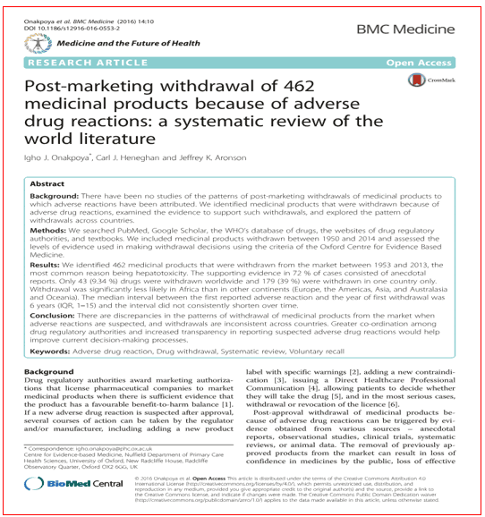 Muitos outros estudos seguem esta linha, mas existe um que merece reflexão (e deve ser considerado pela ERC na deliberação) – e que justifica o papel activo e atento da imprensa. Trata-se do artigo científico, publicado na revista BMC Medicine em 2016, intitulado “Post-marketing withdrawal of 462 medicinal products because of adverse drug reactions: a systematic review of the world literature” (FICHEIRO 17). Analisando todos os produtos medicinais retirados devidos a reacções adversas, os autores referem o seguinte: