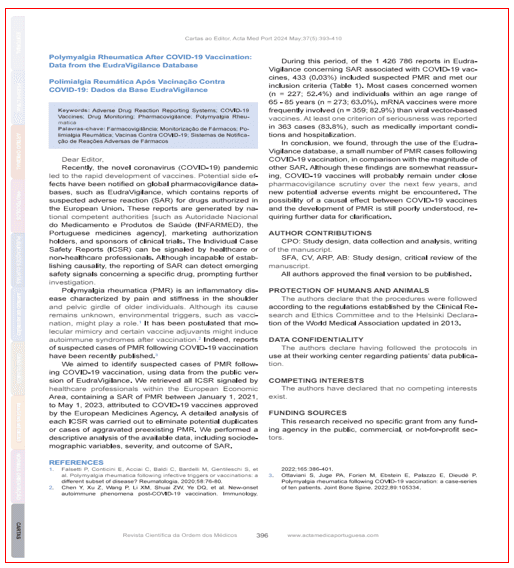 3 – Pinto Oliveira C, Ferreira Azevedo S, Vilafanha C, Prata AR, Barcelos A. Polymyalgia Rheumatica After COVID-19 Vaccination: Data from the EudraVigilance Database. Acta Med Port [Internet]. 2024 Apr. 12 [cited 2024 Jul. 1];37(5):396-7. (FICHEIRO 23)