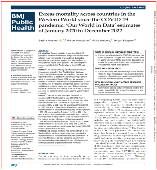 Embora as vacinas contra a COVID-19 tenham sido fornecidas para proteger os civis do sofrimento causado pela morbidade e mortalidade pelo vírus COVID-19, eventos adversos suspeitos também foram documentados. A análise secundária dos ensaios clínicos randomizados de fase III, controlados por placebo, das vacinas de mRNA contra a COVID-19 mostrou que o ensaio da Pfizer teve um risco 36% maior de eventos adversos graves no grupo vacinado. A diferença de risco foi de 18,0 por 10.000 vacinados (IC 95% 1,2 a 34,9) e a razão de risco foi de 1,36 (IC 95% 1,02 a 1,83). O ensaio da Moderna teve um risco 6% maior de eventos adversos graves entre os receptores da vacina. A diferença de risco foi de 7,1 por 10.000 vacinados (IC 95% −23,2 a 37,4) e a razão de risco foi de 1,06 (IC 95% 0,84 a 1,33). Por definição, esses eventos adversos graves levam a morte, são ameaçadores à vida, requerem hospitalização (ou prolongamento dela), causam incapacidade/persistente/significativa, preocupam uma anomalia congênita/defeito de nascença ou incluem um evento medicamente importante de acordo com o julgamento médico. Os autores da análise secundária apontam que a maioria desses eventos adversos graves dizem respeito a condições clínicas comuns, por exemplo, acidente vascular cerebral isquémico, síndrome coronariana aguda e hemorragia cerebral. Essas condições clínicas comuns dificultam a suspeita clínica e, consequentemente, sua detecção como reações adversas à vacina. Tanto profissionais de saúde quanto cidadãos relataram lesões graves e mortes após a vacinação a vários bancos de dados oficiais no mundo ocidental, como o VAERS nos EUA, o EudraVigilance na União Europeia e o Yellow Card Scheme no Reino Unido. Um estudo comparando os relatos de eventos adversos ao VAERS e EudraVigilance após vacinas de mRNA contra a COVID-19 versus vacinas contra a gripe observou um maior risco de reações adversas graves para as vacinas contra a COVID-19. Essas reações incluíam doenças cardiovasculares, coagulação, hemorragias, eventos gastrointestinais e tromboses. Numerosos estudos relataram que a vacinação contra a COVID-19 pode induzir miocardite, pericardite e doenças autoimunes. Exames post mortem também atribuíram miocardite, encefalite, trombocitopenia trombótica imune, hemorragia intracraniana e trombose disseminada às vacinações contra a COVID-19. A Food and Drug Administration observou em Julho de 2021 que os seguintes eventos adversos potencialmente graves das vacinas da Pfizer merecem monitoramento e investigação adicionais: embolia pulmonar, infarto agudo do miocárdio, trombocitopenia imune e coagulação intravascular disseminada. A compreensão das taxas de mortalidade excessiva nos anos seguintes à declaração da pandemia pela OMS é crucial para os líderes governamentais e formuladores de políticas avaliarem suas políticas de crise sanitária. Este estudo, portanto, explora a mortalidade excessiva no mundo ocidental de 1 de Janeiro de 2020 até 31 de Dezembro de 2022.