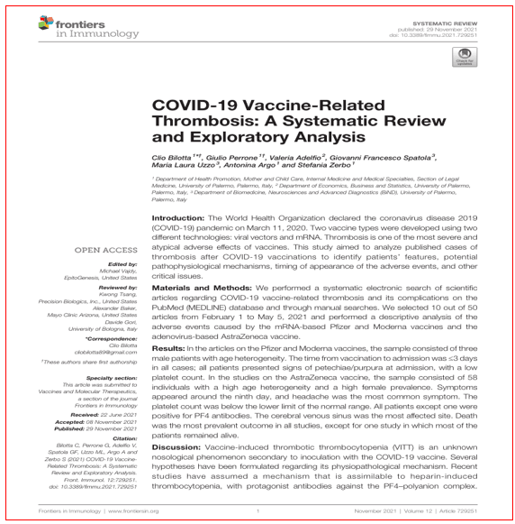 1 – Bilotta, C.; Perrone, G.; Adelfio, V.; Spatola, G.F.; Uzzo, M.L.; Argo, A.; Zerbo, S. COVID-19 Vaccine-Related Thrombosis: A Systematic Review and Exploratory Analysis. Front Immunol 2021, 12, 729251. (FICHEIRO 28)