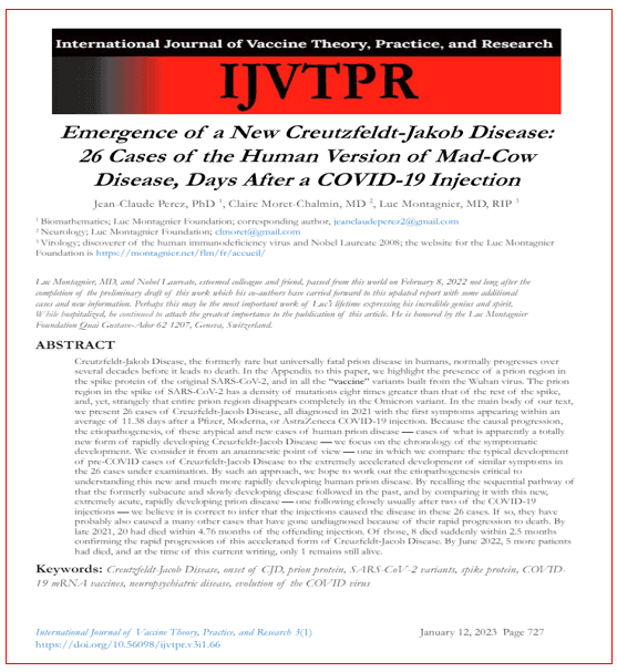 20 – Perez, J., Moret-Chalmin, C., & Montagnier, L. (2023). Emergence of a New Creutzfeldt-Jakob Disease: 26 Cases of the Human Version of Mad-Cow Disease, Days After a COVID-19 Injection. International Journal of Vaccine Theory, Practice, and Research. (FICHEIRO 47)