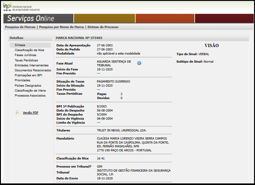 Segundo os registos no Instituto Nacional de Propriedade Industrial (INPI), desde 23 de Novembro de 2020 que a marca da revista Visão tem o seguinte averbamento: “[sic] penhora à ordem do instituto de gestão financeira da segurança social, i.p. exequente: secção de processo executivo de lisboa ii – instituto de gestão financeira da segurança social, i.p. executado: trust in news, unipessoal lda”. Segundo os dados do INPI, o pagamento de taxas relativas à manutenção da marca está suspenso a aguardar “sentença de tribunal”.
