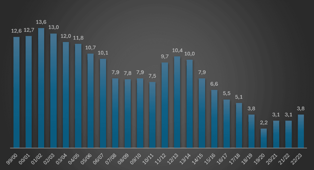 A realidade é bem diferente. Face ao ano lectivo anterior, a taxa de retenção na globalidade do ensino básico registou um acréscimo de 0,8 pontos percentuais, cifrando-se em 3,8%. Este valor é semelhante ao registado em 2018/2019, mas há está bem abaixo do nível de ‘chumbos’ até ao ano lectivo de 2013/14 que rondava ou ficava acima dos 10%, chegando mesmo a aproximar-se dos 20% no 3º ciclo. Independentemente da melhorias no ensino, foram também orientações administrativas para dificultar os ‘chumbos’ – ou facilitar as aprovações – que estavam a contribuir fortemente para uma redução das taxas de retenção até ao início da pandemia (ano lectivo 2019/2020). A partir desse ano, a tendência inverteu-se.