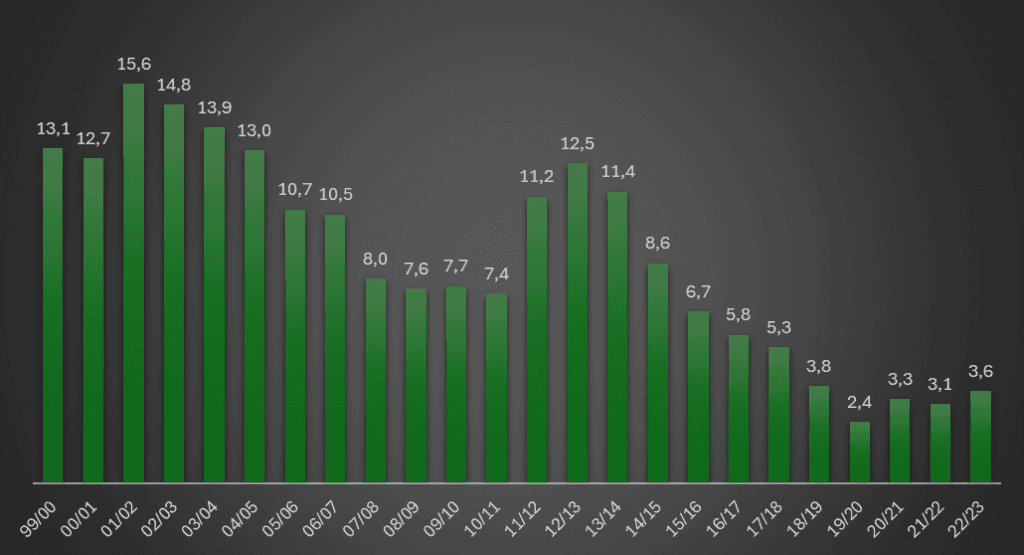 Em termos absolutos, no ano lectivo de 2012/2013 frequentaram o ensino básico quase 1,2 milhões de alunos, pelo que, com essa taxa de retenção (10,4%), terão chumbado cerca de 120 mil alunos, sendo que cerca de 69 mil estavam no 3º ciclo. Se considerarmos as taxas de retenção de 2019/2020, também por força da redução da população jovem, de entre os 970 mil alunos do ensino básico nesse ano houve pouco mais de 19 mil ‘chumbos’, sendo que quase 11 mil frequentavam o 3º ciclo.