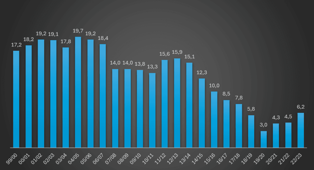 O agravamento na taxa de retenção mostra-se mais evidente nos alunos do 3º ciclo do ensino básico, que compreende o 7º, 8º e 9º ano de escolaridade. A taxa de retenção (incluindo por desistência) mais do que duplicou entre 2019/2020 e 2022/2023. No ano lectivo que apanhou o início da pandemia da covid-19 (2019/2020), a taxa de ‘chumbos’ situou-se em 3,0% – o valor mais baixo de sempre –, para subir no ano lectivo seguinte (ainda com fortes restrições nas aulas presenciais, com a imposição de máscaras e condicionamento de recreios, além de aulas online) para os 4,3%. No ano lectivo de 2021/2022, a taxa voltou a subir ligeiramente (4,6%) e em 2022/2023 (dados agora revelados pelo INE) voltou a subir para os 6,2%, suplantando mesmo os valores do ano lectivo de 2018/2019. ↓