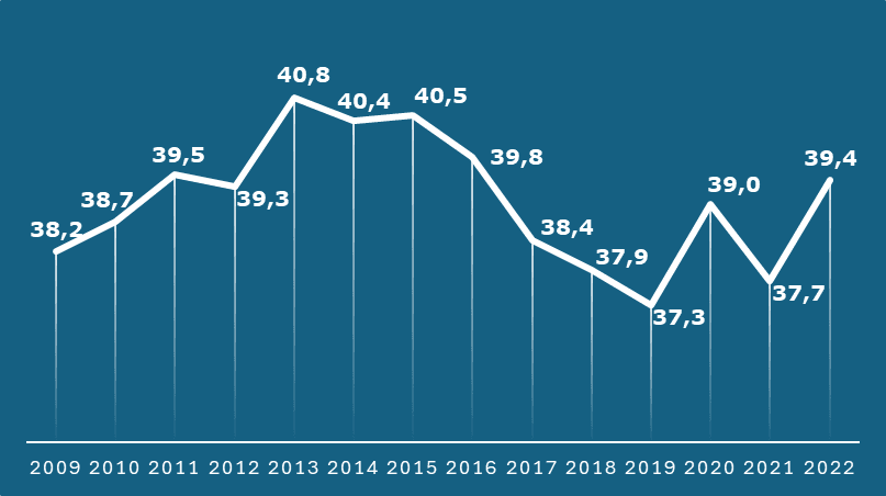 Contudo, em 2020, o indicador disparou para 39% face aos 37,3% registados no ano anterior. Em 2021, melhorou para 37,7% mas voltou a subir, fixando-se em 39,4% em 2022.