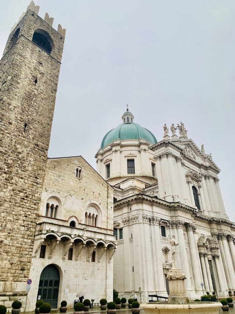Estacionámos o carro alugado no parque de estacionamento da “Piazza della Vittoria”, e daí seguimos a pé. Nesta praça nota-se o estilo racionalismo italiano, de 1926-1943, onde se localiza o Palazzo de la Poste; o Il Torrione, o primeiro arranha-céus italiano e, primeiro da Europa, construído em cimento armado. Seguimos a pé para a Piazza della Loggia, construída na época em que Brescia fazia parte da República de Veneza. Aqui encontramos o magnífico Palazzo della Loggia e a bonita Torre do Relógio. Depois, seguimos a pé pelos corredores de lojas até à Piazza del Duomo onde a Duomo Nuevo e a Duomo Vecchio se encontram e juntos fazem o postal da cidade. É obvio que a Duomo Vecchio é muito mais fascinante, em primeiro lugar por ser um edifício redondo, e depois pela histórica que carrega, com ruínas de mosaicos paleocristãos.