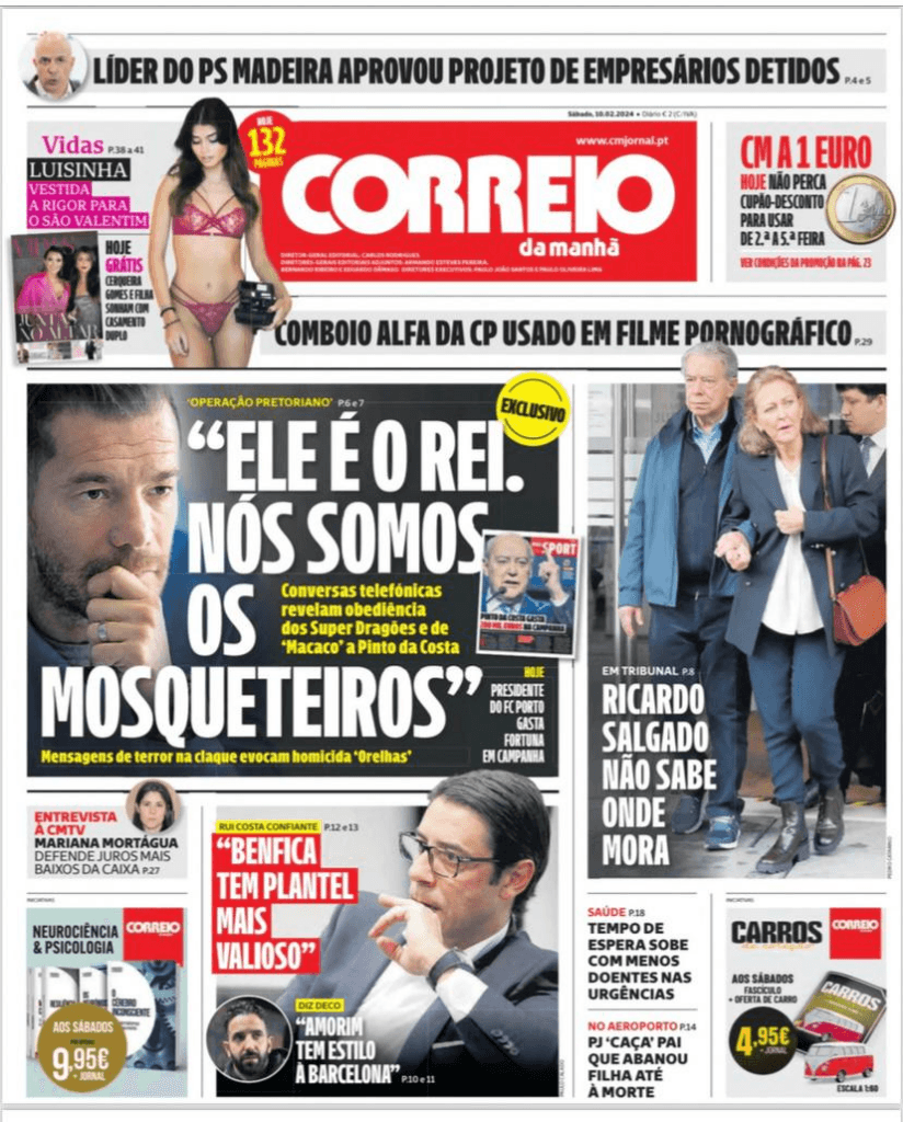Isso não se faz! Então não é que hoje, bem no topo da primeira página, logo abaixo do seu nome, e no lado esquerdo de uma menina de lingerie vermelha, o Correio da Manhã (CM) titula: “Comboio Alfa da CP usado em filme pornográfico“, levando, imagino, uma percentagem superior a 0% dos leitores (reparem no nosso extremo rigor, jamais nos podem chamar de exagerados) a correr à página 29, nem sequer reparando, à primeira vista, que a cabeça do Ricardo Salgado (que dizem não estar já ‘bom’ da cabeça) quase tapa o ‘porn’ do pornográfico.