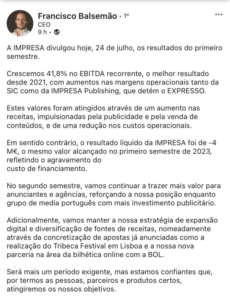 Nem uma palavra para os leitores e telespectadores. Nem uma palavra para o jornalismo. Nada. A Impresa hoje só quer dar “mais valor” aos anunciantes, apresentando cada vez menor qualidade nas ‘plataformas’, e às agências (deduzo que também de comunicação), que querem passar comunicação empresarial como se fosse notícias.
