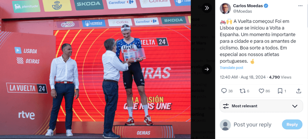 Foi ver onde parou Moedas nesse dia, em que não teve tempo para dar um saltinha à chegada da Vuelta a Portugal no município que preside. Tarefa fácil, porque a agenda do nosso alcaide está agora sempre bem patente e presente no X: esteve a ‘inaugurar’ o plantio de 20o árvores em Sete Rios, na Praça Marechal Humberto Delgado, assassinado pela PIDE em Espanha. Olé!