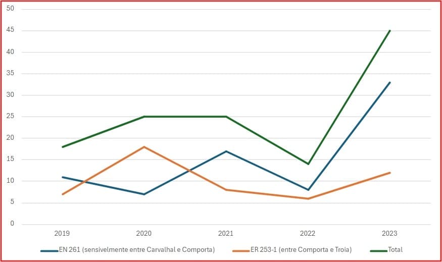 A GNR, através do Comando Territorial de Setúbal, contabilizou, nos últimos cinco anos, um total de 144 acidentes entre o Carvalhal e Tróia. Um terço destes acidentes ocorreu em 2023, com a EN 261 a ser responsável por 86 sinistros e a EN 253-1 por 58. A preocupação das autoridades é justificada: de 14 acidentes em 2022, o número disparou para 45 no ano passado. Também nesse ano, a maior parte dos acidentes ocorreu na EN 261, que registou 33 desastres, face aos 17 observados na EN 253-1.