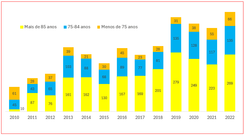 Na verdade, a situação mostra-se particularmente dramática nos muito idosos (maiores de 85 anos). O INE aponta em 2022 uma taxa de 73,1 óbitos por 100 mil pessoas desta idade, ou seja, 16 vezes superior à média nacional (4,5%). Atendendo que este grupo etário contava naquele ano cerca de 368 mil pessoas, o número de óbitos entre os muito idosos foi de 269 pessoas. Esta taxa é substancialmente superior à registada pelo INE em 2010 (apenas 4,5 óbitos por 100 mil pessoas deste grupo etário), mas a partir desse ano tem-se registado um anormal crescimento.