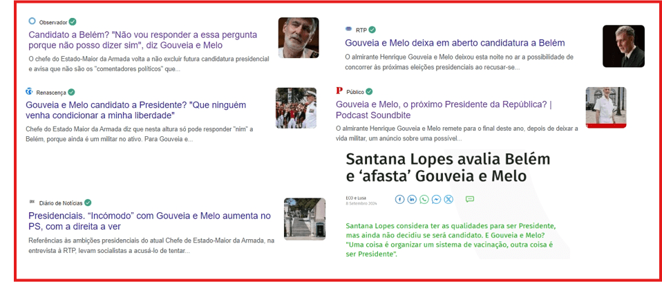 A entrevista do líder da Marinha teve amplo eco mediático, com diversos órgãos de comunicação social a destacar as suas declarações e a possível candidatura do chefe de Estado-Maior da Armada a Belém. Ao volume de notícias juntou-se ainda um coro de comentadores a amplificar as palavras de Gouveia e Melo e posicionando-o como candidato à Presidência da República.