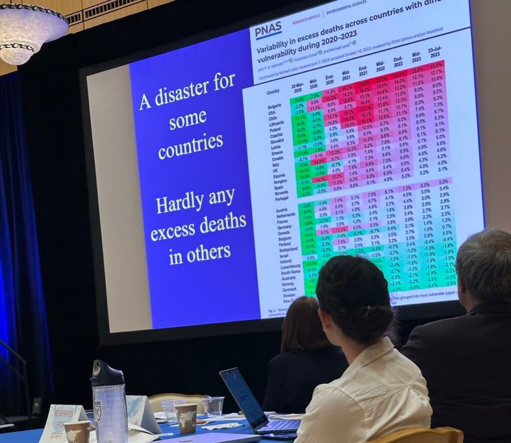 Destacou que, “basicamente, em 34 países com dados de melhor qualidade sobre registo de óbitos, vimos que metade (17) não teve mortes em excesso comparadas aos anos imediatamente anteriores à pandemia, enquanto a outra metade enfrentou realmente um desastre” [Portugal está na metade com os piores dados]. Neste cenário, “os piores foram os Estados Unidos e a Bulgária”. Frisou que, “entre aqueles com menos de 65 anos, os Estados Unidos tiveram números muito piores do que qualquer outro país”. Quanto aos “melhores, foram a Suécia e a Nova Zelândia”, que são “dois países que tiveram abordagens muito diferentes sobre a forma de lidar com a crise”. Aproveitou para elogiar o estratega da resposta sueca: “fico feliz em ter Anders Tegnell connosco hoje. É a primeira vez que nos encontramos pessoalmente, e ele é, sem dúvida, uma lenda”, afirmou.