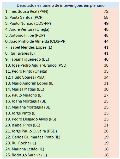 Contabilizando os deputados com 20 ou mais intervenções, apenas se encontram 21 nomes, sendo que destes somente André Ventura (Chega, 48), Aguiar-Branco (PSD, 38), Pedro Pinto (Chega, 35), Hugo Soares (PSD, 34), Pedro Delgado Alves (PS, 23) e Jorge Paulo Oliveira (PSD, 20) integram os três maiores partidos, que, no conjunto, ocupam 206 dos 230 assentos parlamentares, ou seja, cerca de 90% do total.