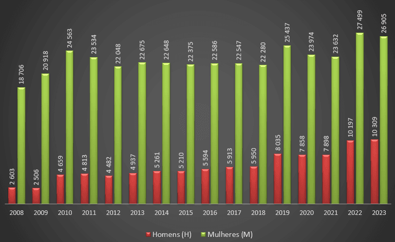 Segundo dados do mesmo Portal, entre Janeiro e o final de Setembro deste ano, houve 23.032 ocorrências registas pela PSP e a GNR referentes a crimes de violência doméstica, mas esta base de dados não apresenta dados discriminados por sexo.