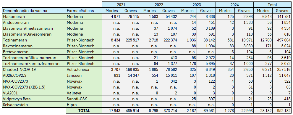 Com efeito, e à medida que a taxa de vacinação com os conhecidos ‘boosters’ se tem reduzido – em Portugal, na época 2023/2024 administraram-se menos de 1,7 milhões de doses, e na época em curso alcançou-se um valor próximo de 1,1 milhões –, os valores contabilizados na área de influência da Agência Europeia do Medicamento (países da União Europeia, Islândia, Liechtenstein e Noruega) desde 2021 são impressionantes. Num levantamento exaustivo a uma base de dados intencionalmente pouco amigável, por exigir uma consulta morosa, o PÁGINA UM contabilizou, desde 2021, associadas às quatro vacinas da Moderna, as cinco vacinas da Pfizer-BionTech, a uma da AstraZeneca, uma da Janssen, as duas da Novavax, uma da Valneva, uma da Sanofi-GSK e uma da Hipra, um total de 952.182 reacções adversas consideradas graves, das quais 28.182 mortes.