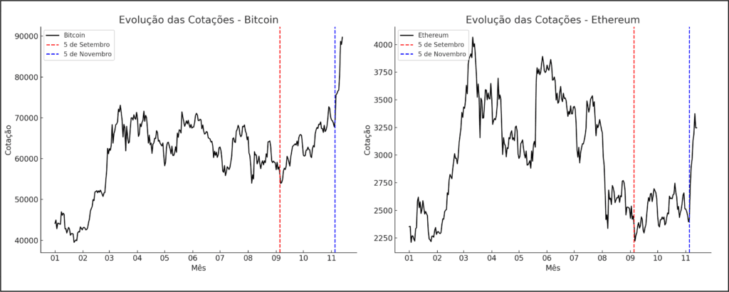Mas, em geral, as moedas e activos virtuais dispararam após a confirmação da vitória de Trump, que é mais favorável a um ambiente pró-criptomoedas. A promessa de Trump de fazer dos Estados Unidos a capital do mundo das criptomoedas foi talvez o argumento mais forte por detrás desta euforia.