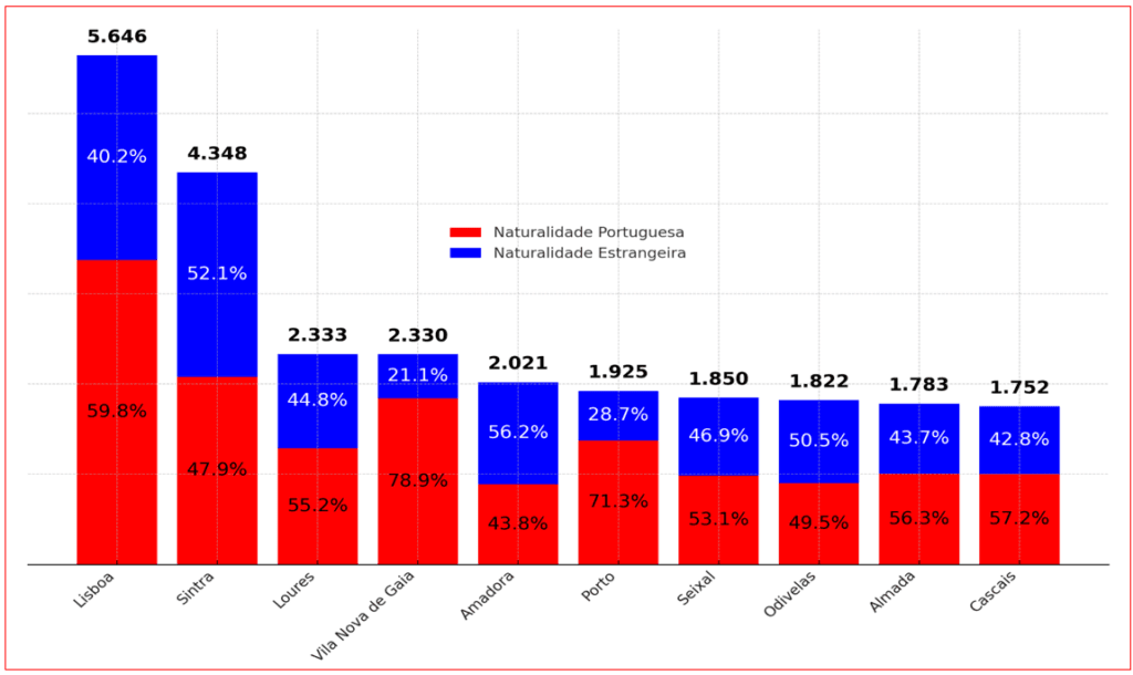 Em concreto, no concelho da Amadora nasceram mais 249 crianças de mãe não-autóctone em comparação com bebés de mães naturais de Portugal (1.135 vs. 886), enquanto em Sintra a diferença foi de 186 (2.267 vs. 2.081) e em Albufeira foi de 139 (337 vs. 198). Nos outros três concelhos, a diferença absoluta foi mais pequena: em Odemira de 73 (174 vs. 101), em Odivelas apenas de 20 (921 vs. 901) e em Aljezur de 19 (42 vs. 23).