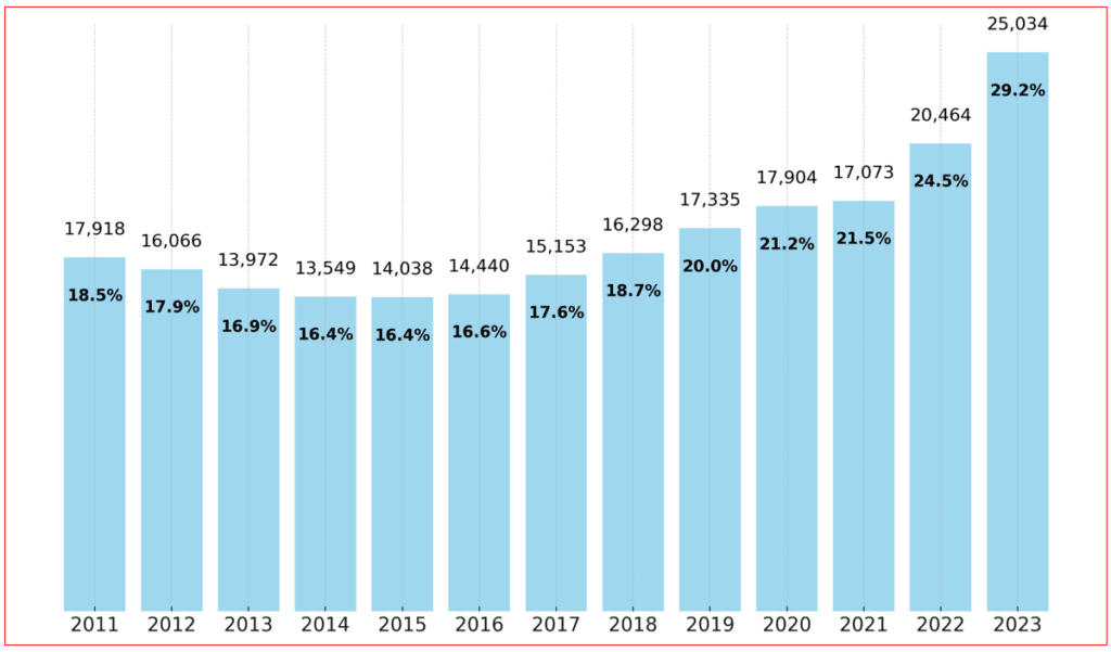 Em 2022, no território nacional, contabilizaram-se 20.464 bebés nascidos de mães com naturalidade estrangeira, representando já 24,5%, e no ano passado subiu para 25.034 nascimentos, significando 29,2% do total. Em apenas dois anos, entre 2021 e 2023, o número de recém-nascidos de mães não-autóctones aumentou quase em oito mil, com o peso relativo a crescer 7,7 pontos percentuais. Se se considerar o ano base de 2014, ou seja, a última década, os partos de nados-vivos com mães de naturalidade estrangeira cresceram 85%. passando de 13.549 para 25.034.