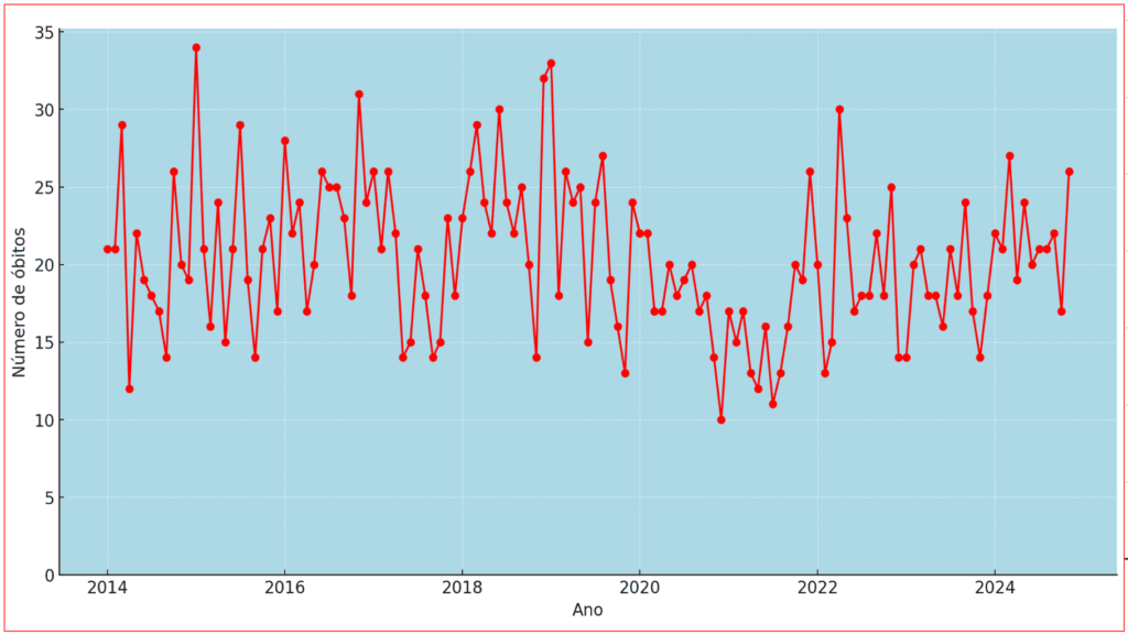 Com a melhoria das condições de vida, de acompanhamento médicos e de terapêuticas, a mortalidade infantil tem-se mantido relativamente estável, embora o valor de 2024 possa marcar uma inversão. Na última década, os meses de Verão (Junho, Julho e Agosto) tendiam a apresentar valores ligeiramente mais baixos de mortalidade infantil na maioria dos anos, observando-se aumentos moderados, em alguns anos, no Outono, especialmente em Outubro e Novembro.